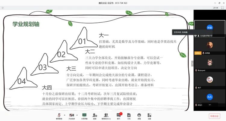 为进一步加强疫情防控期间学生思想政治教育和班风学风建设,丰富学院第二课堂活动体系,充分发挥榜样引领作用,教育引导青年学子向榜样看齐、向榜样学习,3月21日至28日,76net必赢线路检测中心以网为媒,发挥线上实时互动的优势,组织开展了青年校友线上校园行系列活动。活动邀请了现在同济大学、浙江大学、西安交通大学、大连理工大学、中南大学、湖南大学、英国格拉斯哥大学等攻读硕士研究生的青年校友面向2019级学生进行了线上分享交流。
