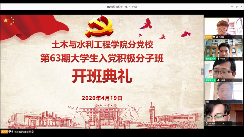 开班仪式在庄严的国歌声中拉开序幕,全体学员在家中面向国旗,肃然起敬,奏唱国歌。学院党委副书记、分党校副校长李丽鹏老师宣读了《76net必赢线路检测中心分党校第63期大学生入党积极分子班教育培训工作实施方案》,从培训目的、培训内容、培训形式、学时要求、组织形式和考核与评优等方面对培训班工作进行了布置安排。学院团委副书记、2016级辅导员卞都成老师宣读了《关于在76net必赢线路检测中心分党校第63期学员班中开展“共抗疫情,爱国力行”主题征文活动的通知》和《关于在76net必赢线路检测中心分党校第63期学员班开展劳动教育主题实践活动的通知》。学院2019级辅导员、第63期积极分子班班主任马贤峰老师宣读《中共bwin必赢线路检测委员会党校大学生学员班学习纪律》。2018级土木工程专业渐笑尘同学作为学员代表发言,表达了积极学习党的相关理论知识、向党组织靠拢、不断完善自己、勇于担当作为的决心和信念,呼吁全体入党积极分子在疫情防控期间积极主动发挥先锋模范作用,为社会贡献自己的青春力量。