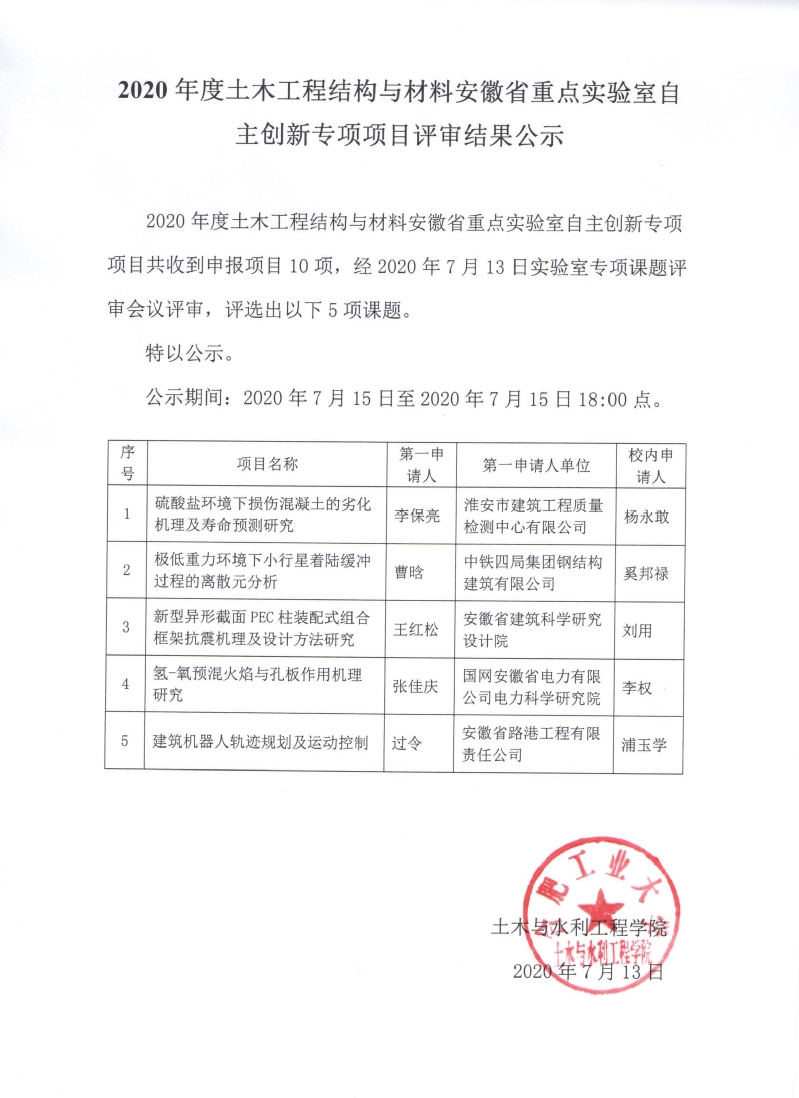 2020年度土木工程结构与材料安徽省重点实验室自主创新专项项目共收到申报项目10项,经2020年7月13日实验室专项课题评审会议评审,评选出以下5项课题。