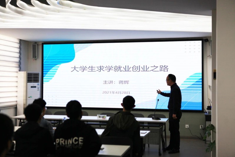 签约仪式后,蒋辉为我院学生做了以《大学生求学就业创业之路》为主题的就业指导讲座,给本科生分享了创业的经历与思考。