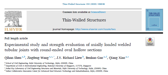 近日,王静峰教授课题组在新型管桁架节点性能研究方面取得了新进展,研究成果发表在国际期刊《Thin-Walled Structures》(JCR Q1IF=4.033)上,论文题为“Experimental study and strength evaluation of axially-loaded welded tubular joints with round-ended elliptical hollow sections. Thin-Walled Structures, 2020, 154: 106846.”,青年教师沈奇罕为论文第一作者,王静峰教授为通讯作者,新加坡国立大学工程院院士Richard Liew教授为论文第二作者,该项工作得到教育部新世纪优秀人才支持计划项目资助。