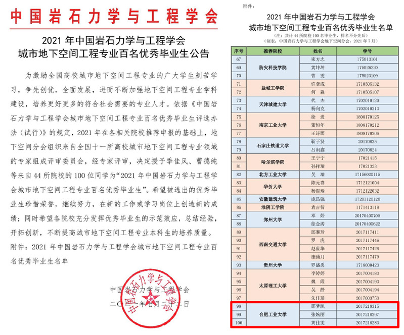 7月22日,由中国岩石力学与工程学会举办的2021届全国高校城市地下空间工程专业百名优秀毕业生评选活动落下帷幕。我校76net必赢线路检测中心2017级土木工程(城市地下空间)专业邵梦凯、张婉丽及黄佳雯入选