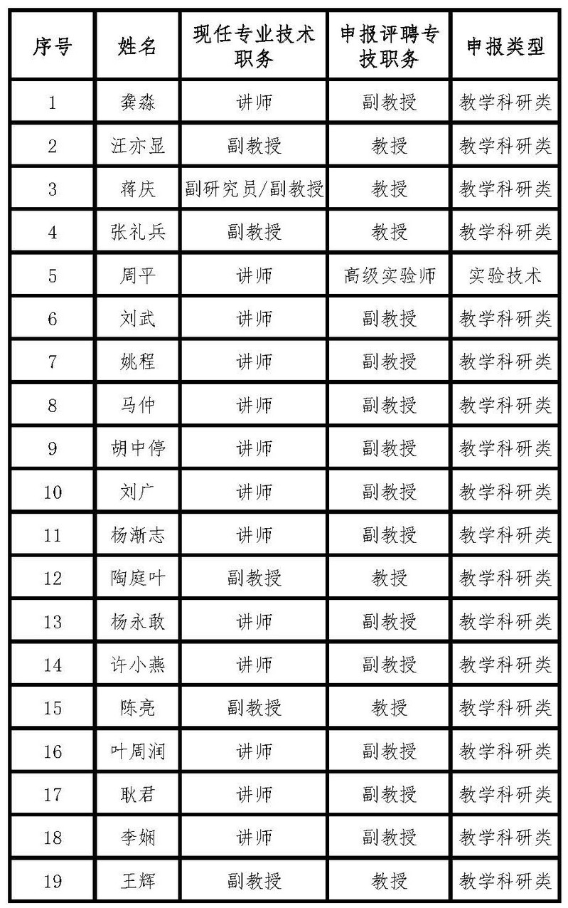 根据学校《关于开展2020年度高级专业技术职务评聘工作的通知》要求,现对本单位2020年度高级专业技术职务申报人员的材料进行公示,申报人员名单如下: