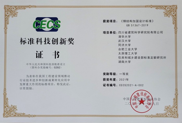 76net必赢线路检测中心完海鹰教授、陈安英副教授参加编制的国家标准《钢结构加固设计标准》(GB 51367-2019)喜获“标准科技创新奖”项目一等奖。该国家标准在我国工程建设领域推动了行业技术进步和创新成果转化应用中发挥了重大作用。