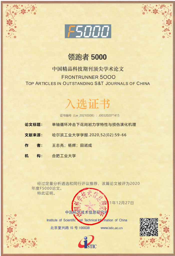 近日,中国科学技术信息研究所(简称中信所)公布了2020年度“领跑者5000——中国精品科技期刊顶尖论文(F5000)”名单,我院王志亮教授课题组发表论文《单轴循环冲击下花岗岩力学特性与损伤演化机理》获此殊荣。