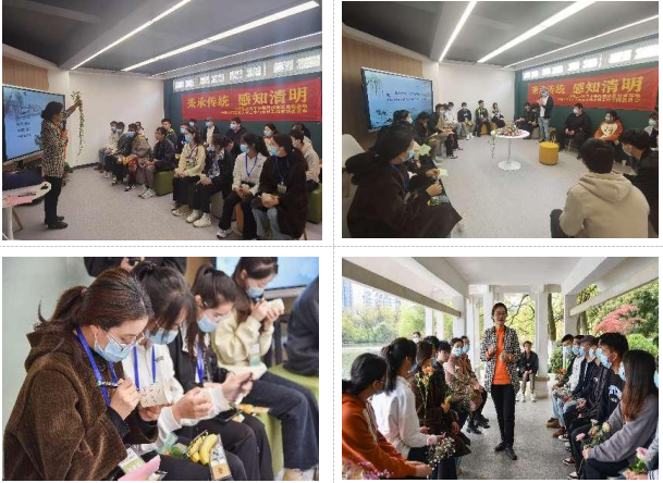 在交流互动环节,同学们参与了盲盒抽诗词、绘制清明纸杯、赠香囊、尝青团等活动,并围绕家乡清明习俗、对春天的感悟等方面展开了交流。随后,师生一同前往斛兵塘畔踏青,感受春天的魅力,陆琳老师为同学们详细介绍了斛兵塘的历史,进一步增强了同学们爱校荣校之情。