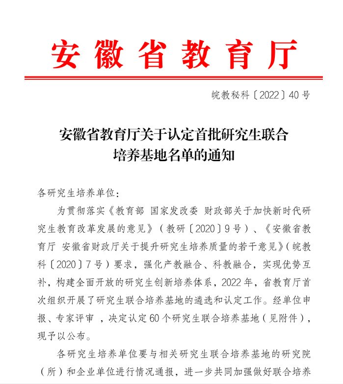 近日,安徽省教育厅组织开展了省级研究生联合培养基地的遴选和认定工作,经单位申报、专家评审,最终遴选出60个首批省级研究生联合培养基地(皖教秘科〔2022〕40号)。我院联合安徽省路港工程有限责任公司、安徽富煌钢构股份有限公司申报了省级研究生联合培养基地,均成功入选。