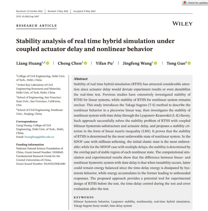 近日,76net必赢线路检测中心实验中心副主任黄亮在实时混合模拟试验方法研究取得新进展。研究成果发表在国际结构动力学Top期刊《Earthquake Engineering & Structural Dynamics》(JCR Q1,IF=4.43)上,论文题为“Stability analysis of real time hybrid simulation under coupled actuator delay and nonlinear behavior”。bwin必赢线路检测黄亮为论文第一作者兼通讯作者,硕士研究生卜逸凡和王静峰教授参加,该项工作与美国旧金山州立大学Chen Cheng教授和东南大学郭彤教授联合完成,得到国家自然科学基金(52008145)和土木工程结构与材料安徽省重点实验室自主创新专项(PA2021GDSK0080)项目资助。