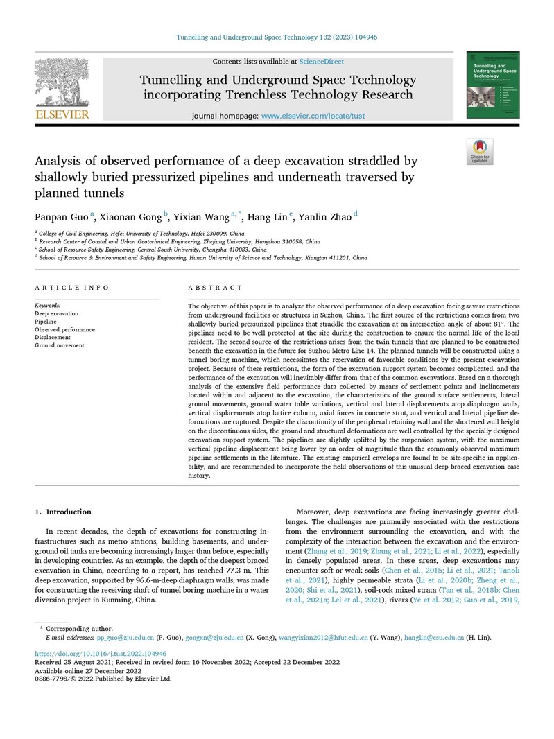 近日,76net必赢线路检测中心汪亦显教授团队在隧道及地下工程领域顶尖期刊《Tunnelling and Underground Space Technology》上发表题为“Analysis of observed performance of a deep excavation straddled by shallowly buried pressurized pipelines and underneath traversed by planned tunnels”的研究论文。我校青年教师郭盼盼博士为第一作者,汪亦显教授为通讯作者。