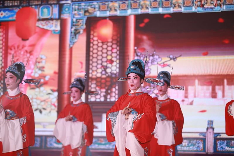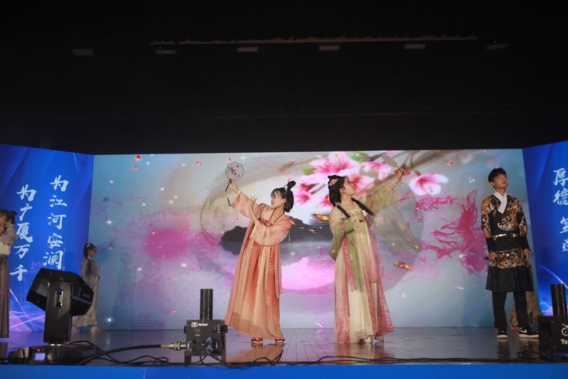 在“古风徽韵”篇章中,学院2022届本科校友海严用钢琴独奏《多远都要在一起》和《山丹丹开花红艳艳》曲目,让人徜徉在钢琴美妙的音乐世界中流连忘返;谢圣珏、左城等同学身着汉服表演古风走秀《霓裳》,让人领略到汉服之秀美,感受中华文化之博大;王启迪等同学表演的情景剧《跨越千年的对话》,展现了古代与当代文明的融合与碰撞;罗雅琪等同学身着戏服,舞姿翩跹,演唱了黄梅戏《女驸马·谁料皇榜中状元》,富有感染力,引得台下观众掌声雷动。