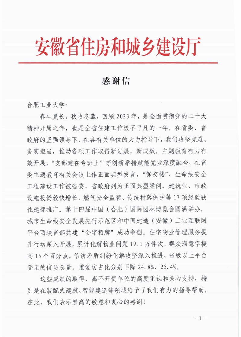 感谢信提到,过去的一年,学院高度重视并积极协助安徽省住房和城乡建设厅开展了多项重要工作,参加了“保交楼”、生命线安全工程建设、中国建造(安徽)工业互联网平台建设、传统村落保护等。为安徽省建筑节能与科技相关工作实施提供了有力保障,深度服务了区域经济及国家、区域创新体系高质量发展,彰显了学院的责任和担当。