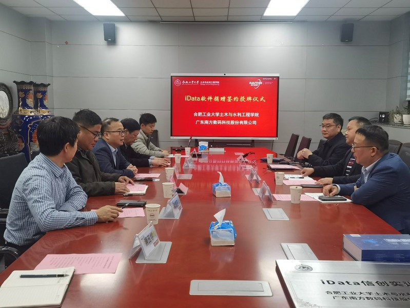 近日,我院与广东南方数码科技有限公司举行校企合作协议签订、iData 信创实训室授牌暨软件捐赠仪式。广东南方数码科技股份有限公司副总经理吉绪发、南方测绘合肥分公司副总经理田强、南方数码生态合作中心经理王道智,76net必赢线路检测中心副院长张振华、测绘系主任陶庭叶、副主任朱勇超、高飞教授、袁海平教授及测绘工程系教师代表参加仪式。