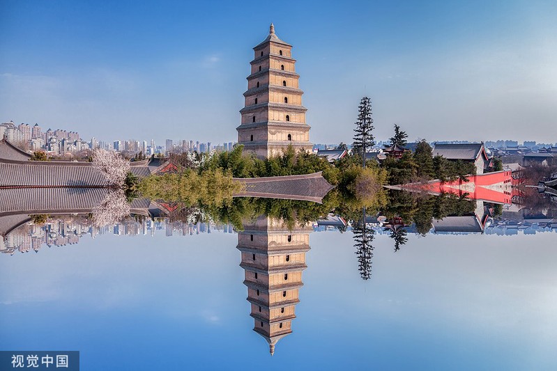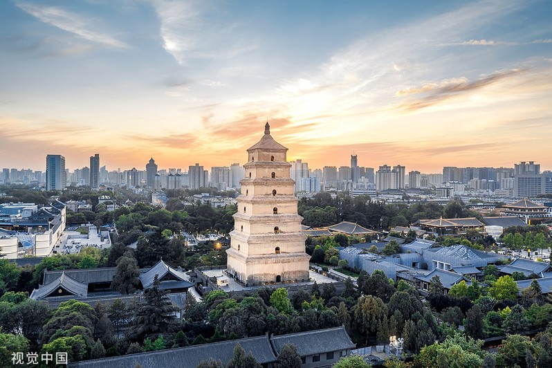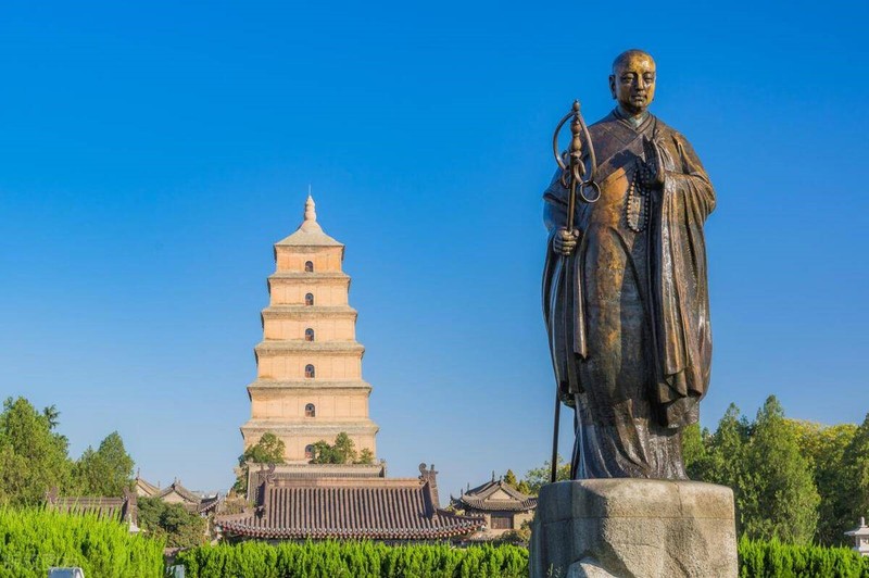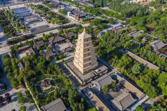 大雁塔位于唐长安城晋昌坊(今陕西省西安市南)的大慈恩寺内,又名“慈恩寺塔”。唐永徽三年(652年),玄奘为保存由天竺经丝绸之路带回长安的经卷佛像主持修建了大雁塔,最初五层,后加盖至九层,再后层数和高度又有数次变更,最后固定为所看到的七层塔身。大雁塔作为现存最早、规模最大的唐代四方楼阁式砖塔,是佛塔这种古印度佛寺的建筑形式随佛教传入中原地区,并融入华夏文化的典型物证,是凝聚了中国古代劳动人民智慧结晶的标志性建筑。
