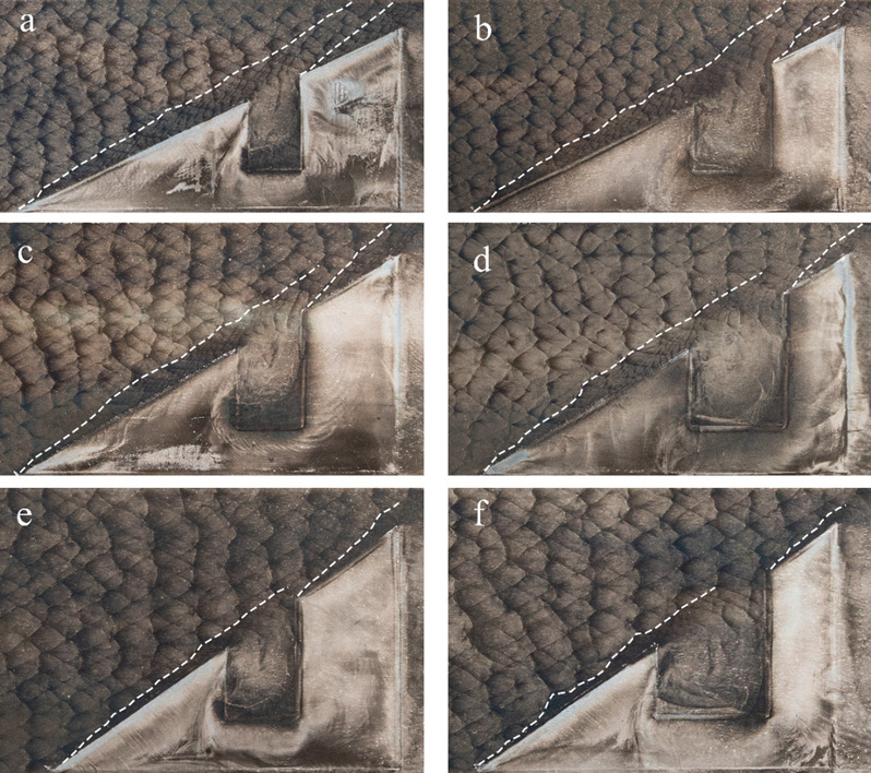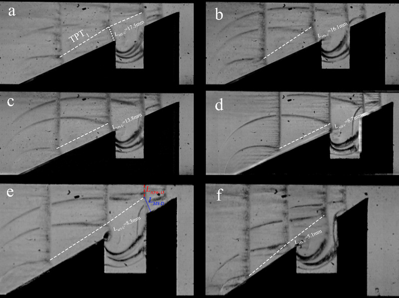 马赫反射现象研究是爆轰研究领域内基础而又重要的部分,在工业可燃气体爆炸预防、爆轰推进系统设计和新型武器研发等领域具有广泛的应用前景。研究团队基于纹影光学流场诊断系统,创新地研究了强衍射条件下马赫反射自相似问题。研究结果表明,在强衍射发生前,马赫反射分别遵循非反应性和反应性自相似定律,即冻结极限和平衡极限。强衍射效应打破马赫反射传播的自相似规律,表现为马赫杆弯曲甚至三波点轨迹在楔块切口上方提前结束。强衍射结束后,弯曲的马赫杆再次诱导马赫反射,但对大多数情况下,第二马赫反射并不具备自相似性。进一步分析表明,第二次马赫反射是否遵循自相似规律,取决于强衍射能否完全影响到整个马赫杆,即三波点到斜面的垂直距离(LMS-D)与稀疏波的传播距离(yc)之比。当LMS-D > yc时,根据非反应性三激波理论,第二次马赫反射不遵循局部自相似,三点轨迹明显偏离冻结极限。当LMS-D < yc时,第二次马赫反射仍然满足自相似。