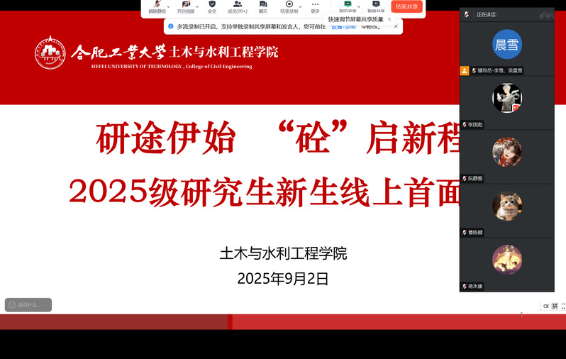 9月2日上午10时,76net必赢线路检测中心依托线上平台,开展“研途伊始,‘砼’启新程”研究生新生线上首面会。学院党委书记王东坡、研究生教学办公室主任陈涛、辅导员李雪、吴晨雪参加会议。2025级300余名硕博新生云端相聚,正式开启研究生阶段的全新旅程。