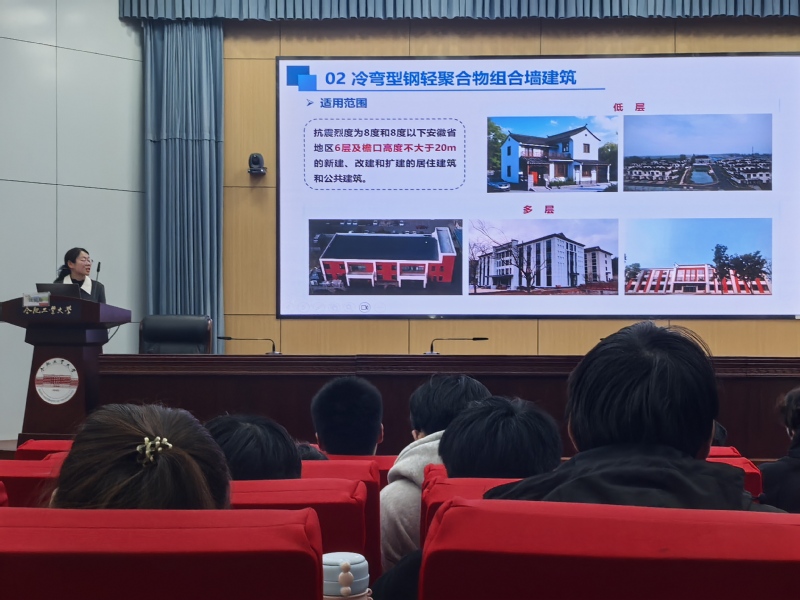汪皖黔老师围绕装配式绿色农房技术体系的三大核心方向展开系统性讲解。在战略背景阐释方面,她分析了装配式绿色建筑研究立足于国家与安徽省乡村建设与绿色发展的战略部署,强调在全面推进乡村振兴、建设“好房子”的大背景下,探索既安全可靠又绿色实用的新型农房建设路径的重要意义;针对材料技术创新,她从材料性能与结构优势两个层面,系统介绍了冷弯型钢轻聚合物组合墙体的特点,并结合课题组近年来的研究成果,通过详实的数据与试验影像,展示了冷弯型钢与轻聚合物材料间的粘结滑移性能研究,以及墙体在冲击荷载下的动力响应与破坏模式分析;关于建造工艺优化,她从建造全过程出发,分模块拆分、单舱制作、单舱运输和多舱装配四个环节,阐释了轻钢模块化建筑体现出的高效化、简易化、精细化与绿色化特征。